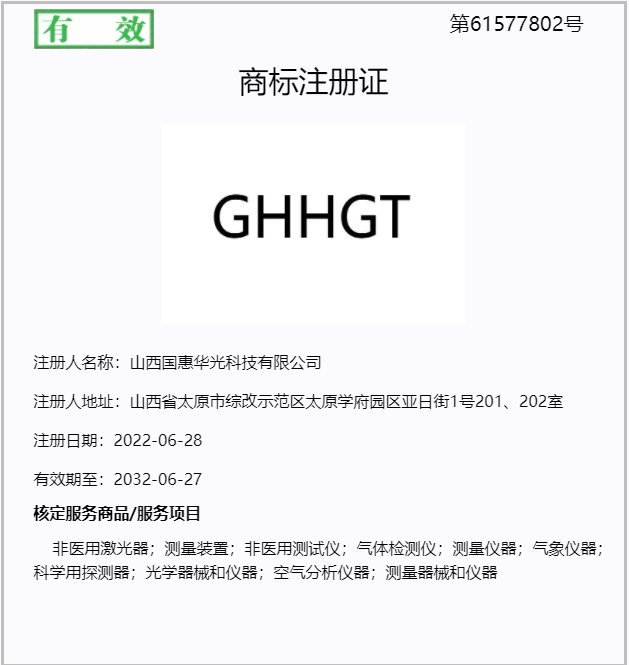 近日,國惠華光申請注冊的“GHHGT”商標(biāo),通過國家知識產(chǎn)權(quán)局審查受理,這標(biāo)志著公司在品牌建設(shè)方面又邁出了關(guān)鍵一步。近年來,國惠華光圍繞企業(yè)定位和產(chǎn)業(yè)特色,聚焦工業(yè)級激光傳感技術(shù)創(chuàng)新,現(xiàn)已擁有激光氣體分析儀、機(jī)動車尾氣遙感監(jiān)測系統(tǒng)、黑煙車電子抓拍系統(tǒng)、全激光束管監(jiān)測系統(tǒng)、溫室氣體監(jiān)測系統(tǒng)等系列產(chǎn)品,已完成從單一產(chǎn)品研發(fā)到行業(yè)解決方案供應(yīng)商的角色轉(zhuǎn)變,實現(xiàn)產(chǎn)品+服務(wù)多種盈利模式。國惠華光品牌知名度不斷提升。申請注冊“GHHGT”品牌商標(biāo),是公司保護(hù)重要無形資產(chǎn)的合法舉措,也有利于提高公司的企業(yè)品牌形象,促進(jìn)業(yè)務(wù)拓展,可為推動公司發(fā)展奠定堅實的基礎(chǔ)。